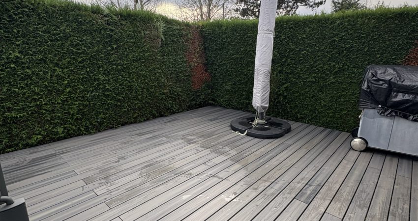 Terrasse de 20 m² avec cabanon accolé équipé d’une cuisine d’été (évier,plaque de cuisson 2 feux gaz, branchement pour lave-linge)