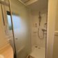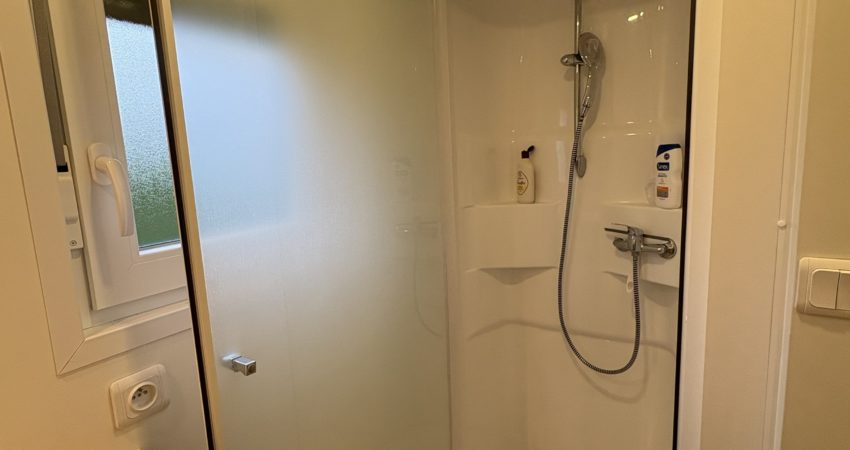 Une salle de bain avec douche et lavabo.